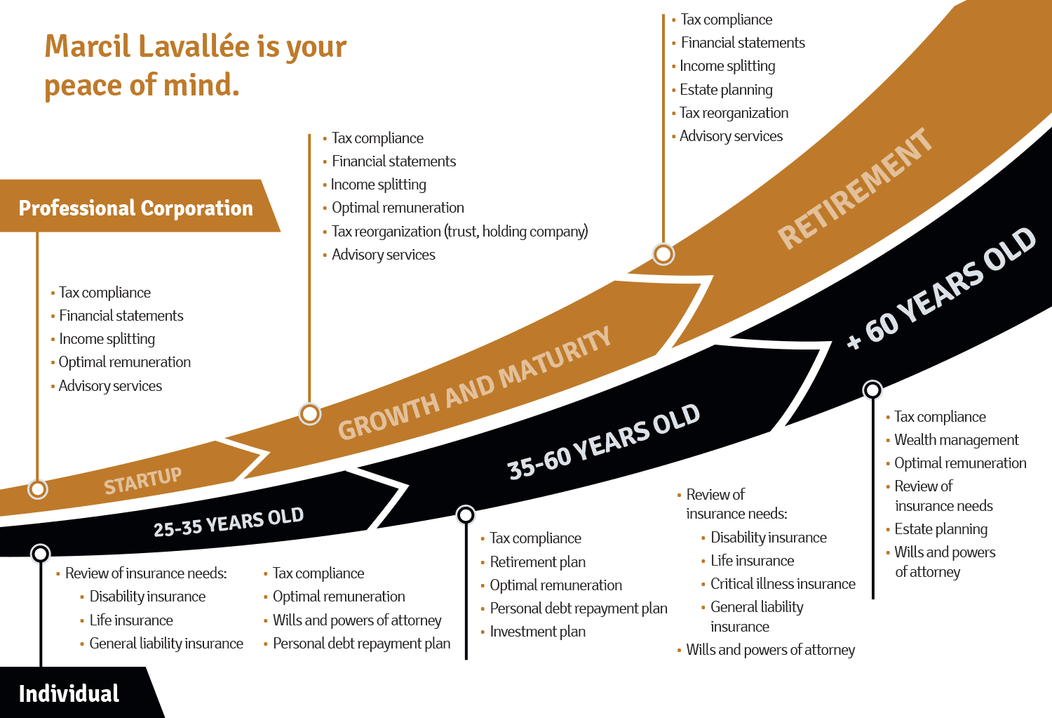 No matter where your business is in its life cycle, our team and our broad range of expertise guarantee complete service and an active presence at all times. Our partners will work to build a trusting relationship with you right from the start.